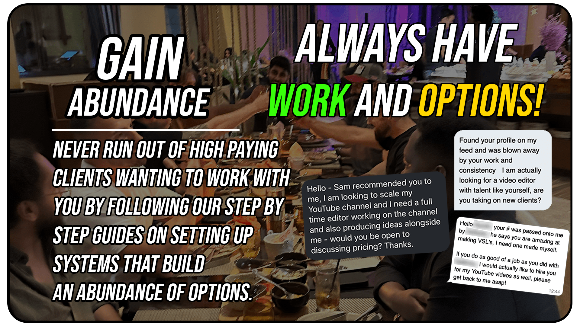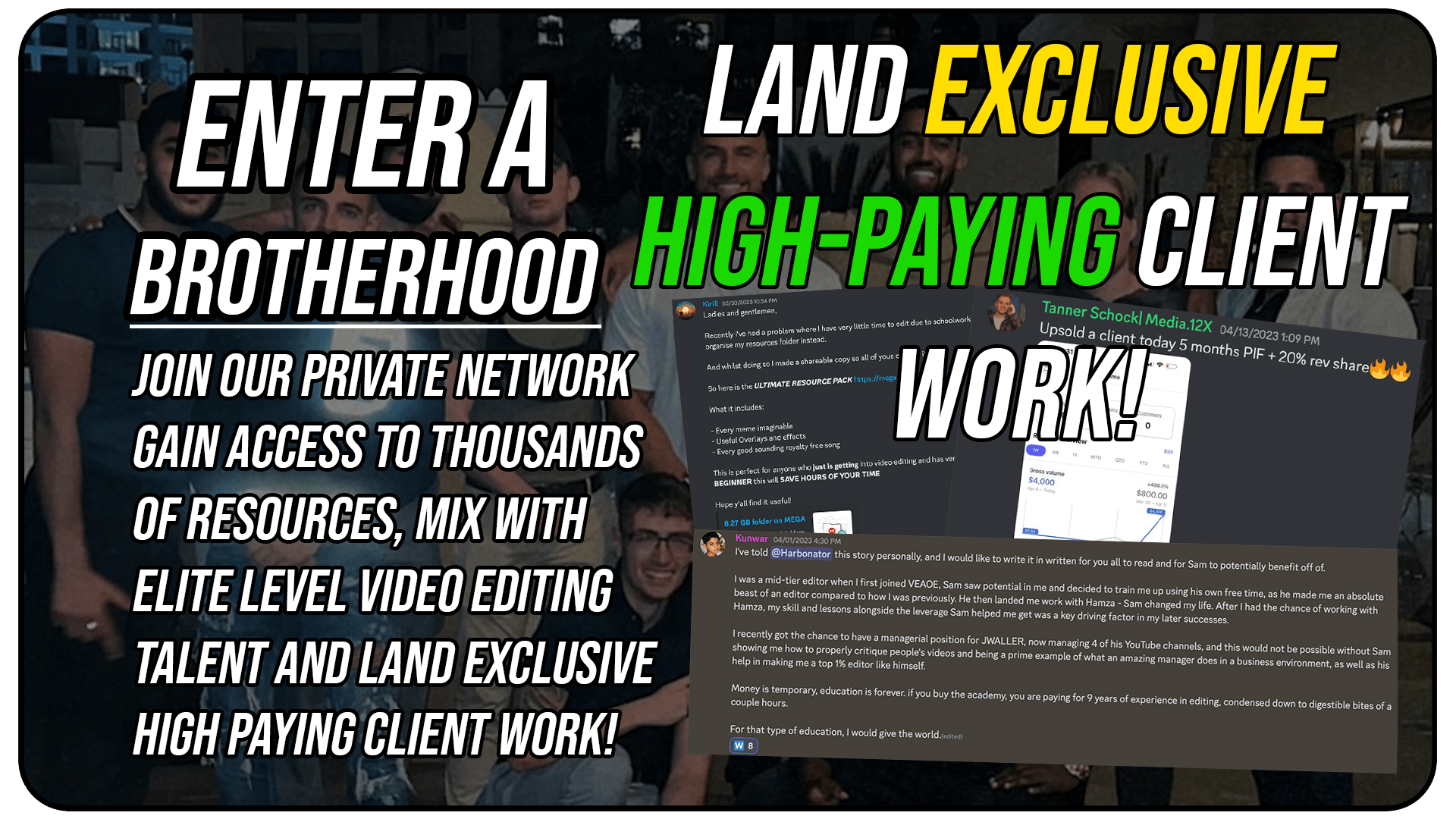 I have designed AOE to be suitable for both complete beginner Video Editors, and also intermediate/advanced Video Editors. AOE has something for everybody - going through the lessons, asking for feedback and mixing with high-level talent inside the network will ensure a fast track to becoming a godlike Video Editor and landing your first high-paying client work and achieving a life of total financial, location and creative freedom.